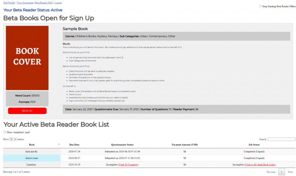 Sign up forms are sent out a couple of days before the Beta Book is due to be sent, and will include all of the necessary details about the Beta Book job. This includes not only the standard details like cover, blurb and genres, but also the number of questions on the questionnaire, length of book, due date and payment amount. Beta readers can also sign up for available books via their dashboard.